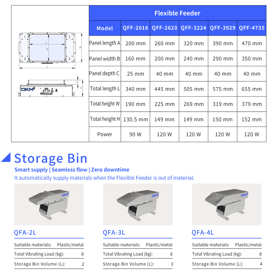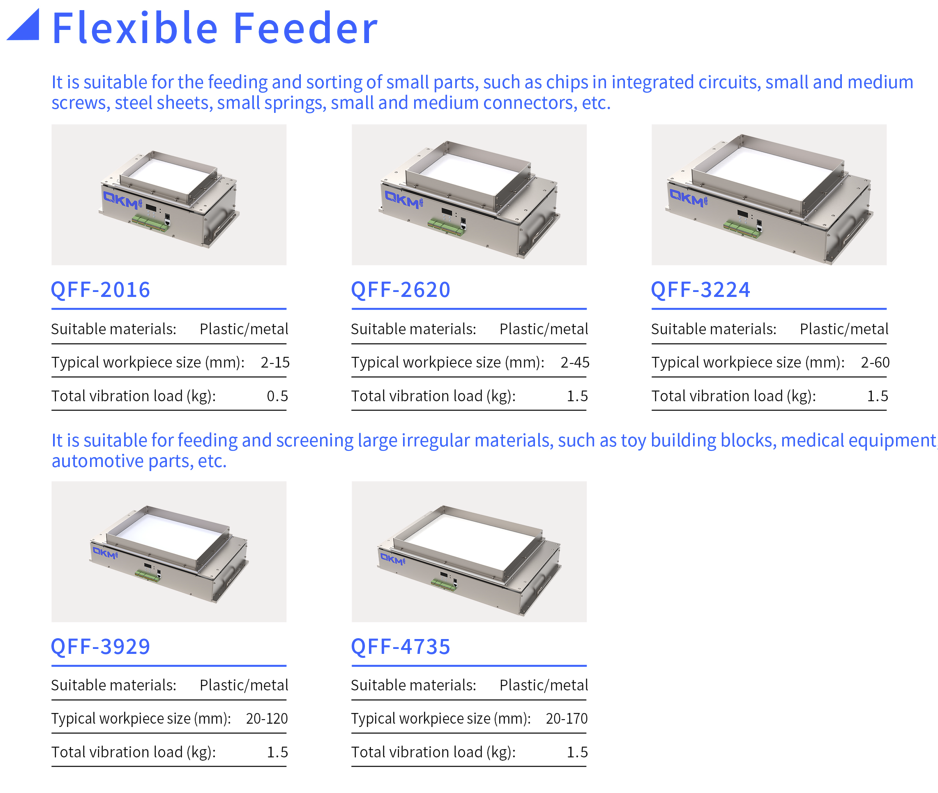 Flexible Feeder System is developed by QKM for flexible feeding of thin-sheet, shaped and silica-gel workpieces, and achieves identification and positioning of workpieces combined with vision to meet needs of feeding small-batch and multi-variety products. It has the following features:
